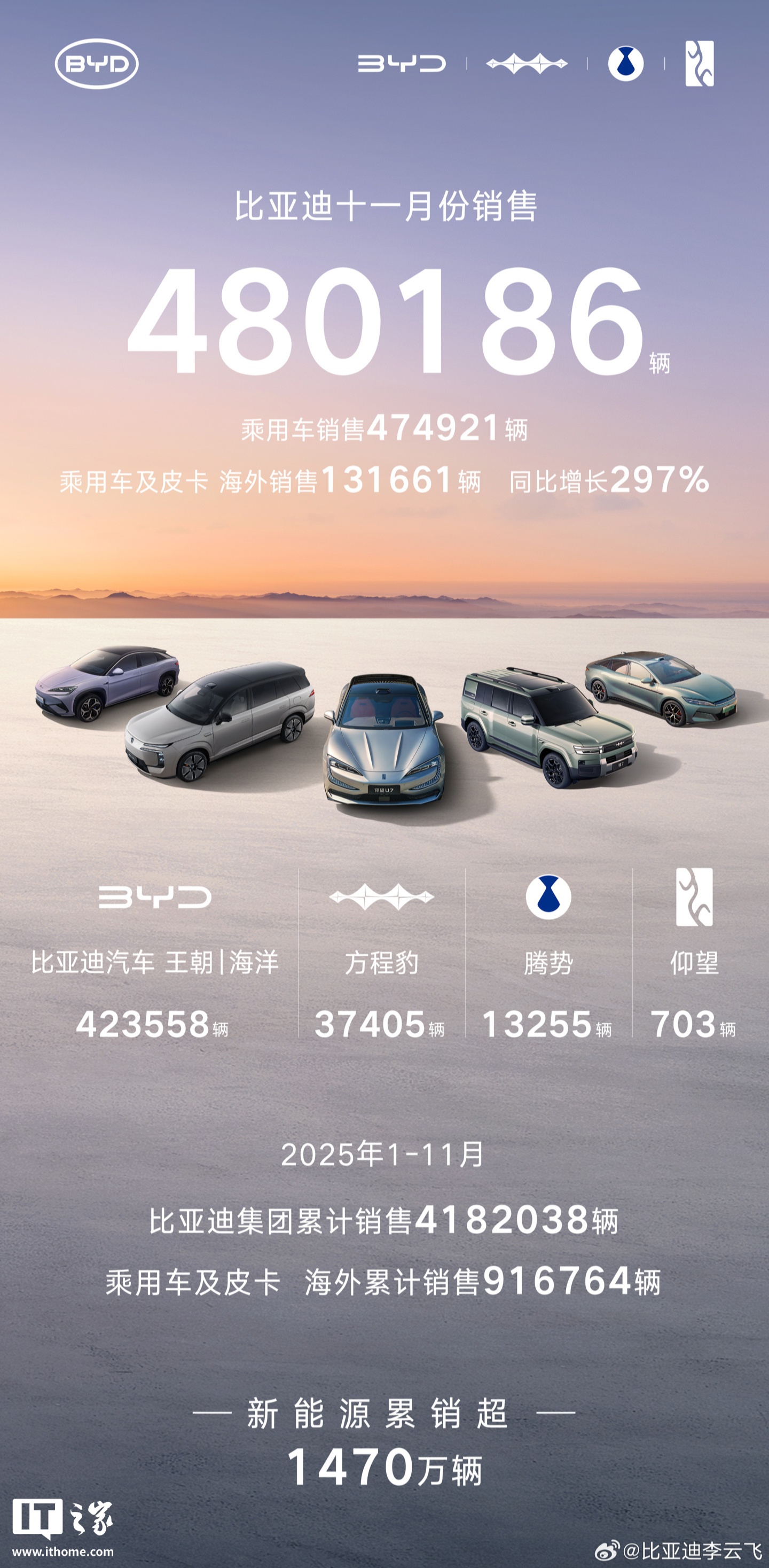 王朝 | 海洋:265734 辆(天神之眼 B / 天神之眼 C)方程豹汽车:34794 辆(天神之眼 B / 天神之眼 C / 华为乾崑智驾)腾势汽车:10049 辆(天神之眼 B / 天神之眼 C)仰望汽车:690 辆(天神之眼 A)今年 11 月,比亚迪汽车销量 480186 辆(去年同期 506804 辆)。今年 1-11 月,汽车销量 418 万辆,同比增长 11.3%。公司 2025 年 11 月新能源汽车动力电池及储能电池装机总量约为 27.669GWh,2025 年累计装机总量约为 258.282GWh。